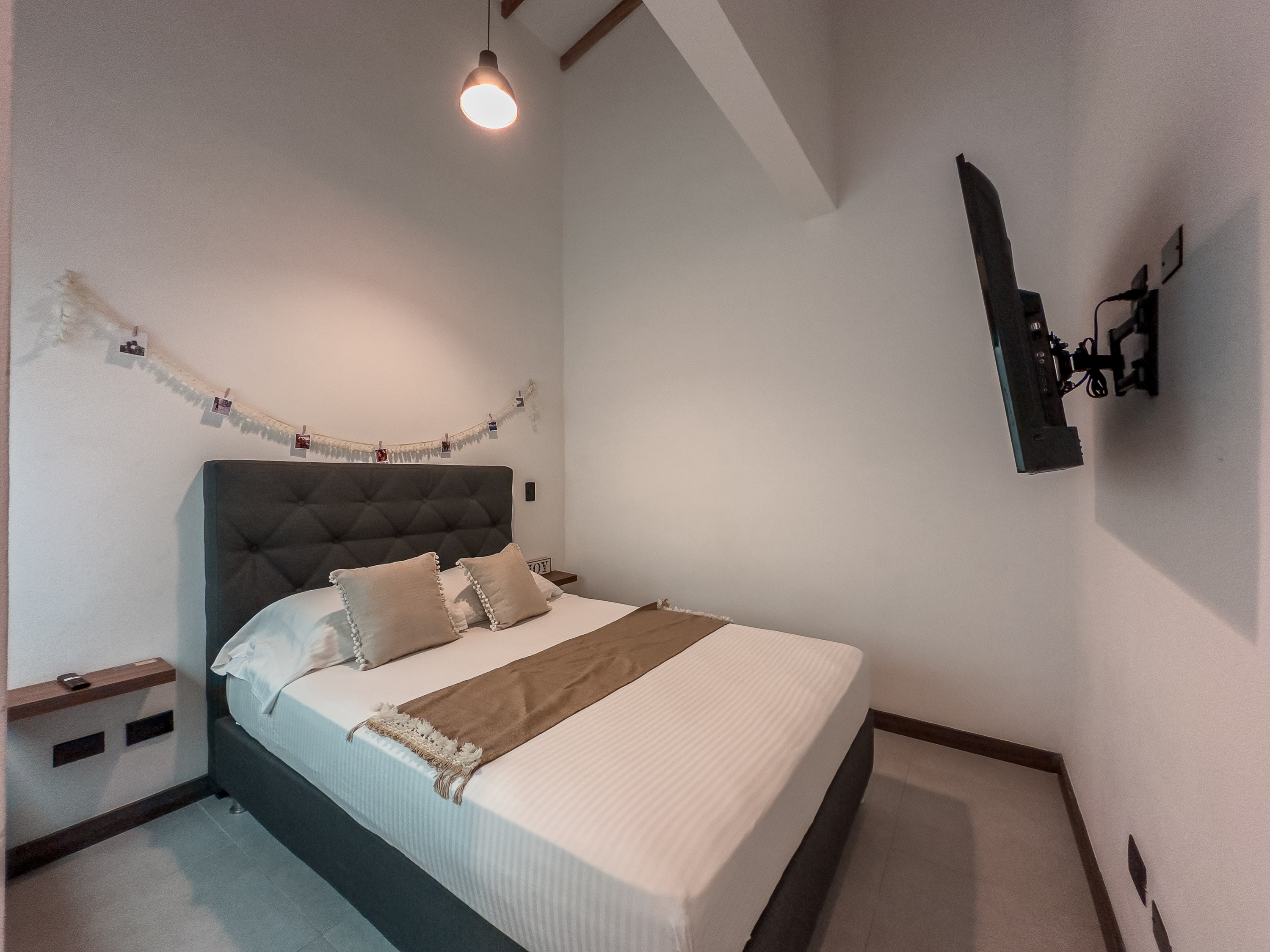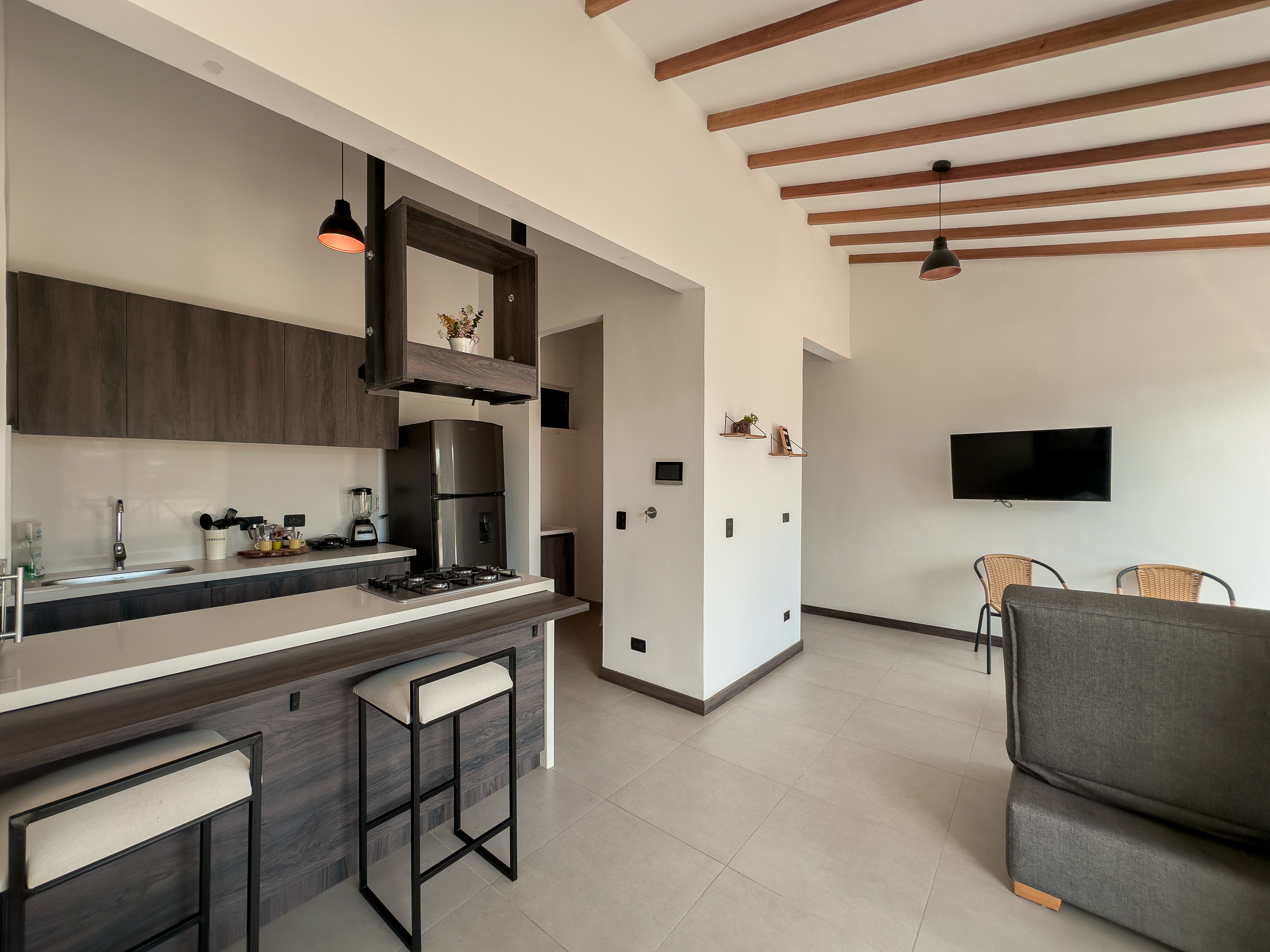 Apartaestudio con cocina, baño, zona de ropas y zona de descanso.