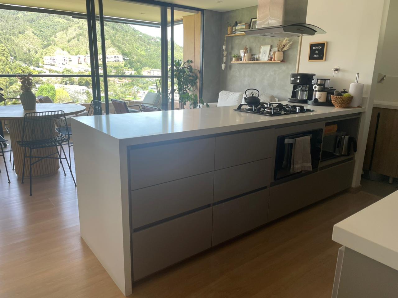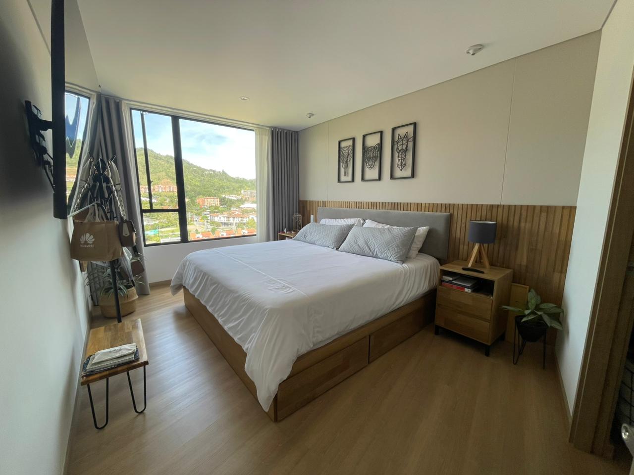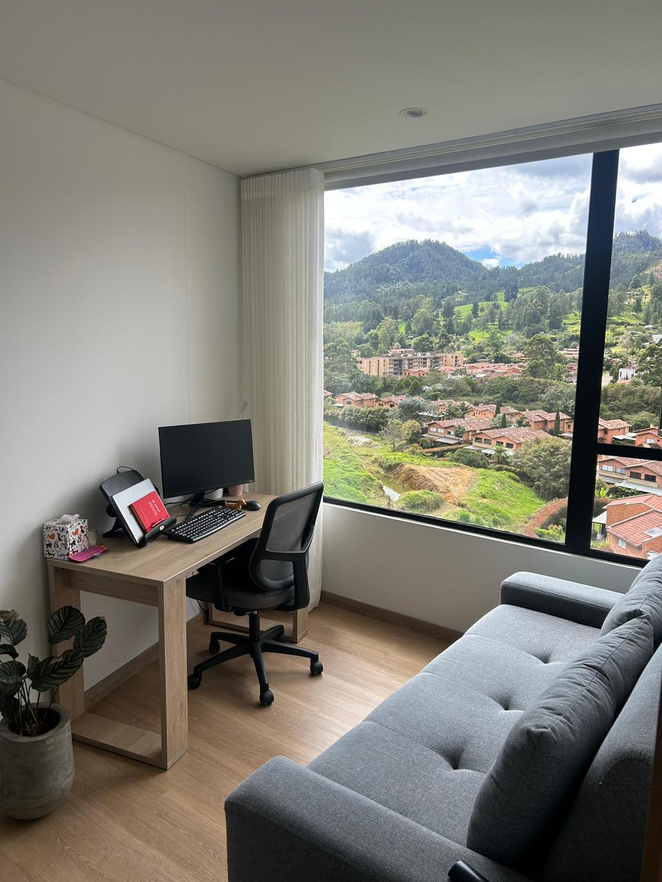 Cuenta con dos alcobas, donde la habitación auxiliar no tiene clóset y puede funcionar también como oficina cerrada, además de dos baños completos, sala comedor y cocina de generosas dimensiones. Dispone de balcón con vista asegurada hacia el pueblo y la montaña, un parqueadero cubierto y un cuarto útil. La unidad residencial ofrece coworking, salón social, zonas húmedas y gimnasio, y se encuentra en una ubicación estratégica, muy cerca al parque principal del municipio, en un sector tranquilo y de fácil acceso pavimentado.