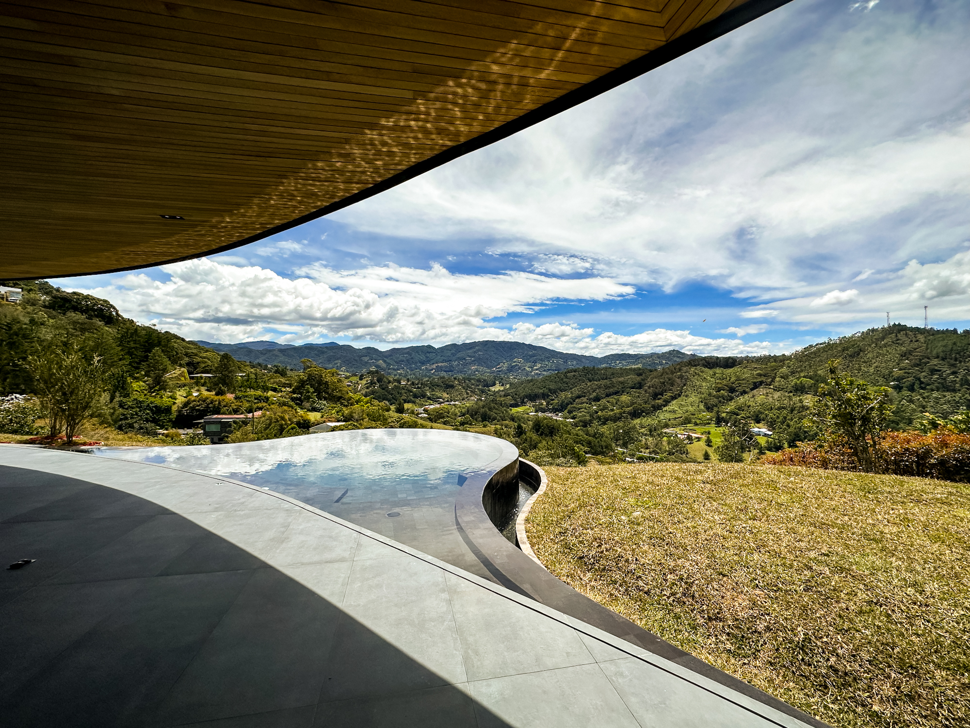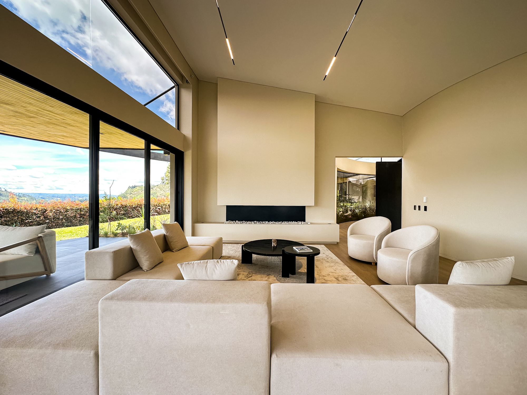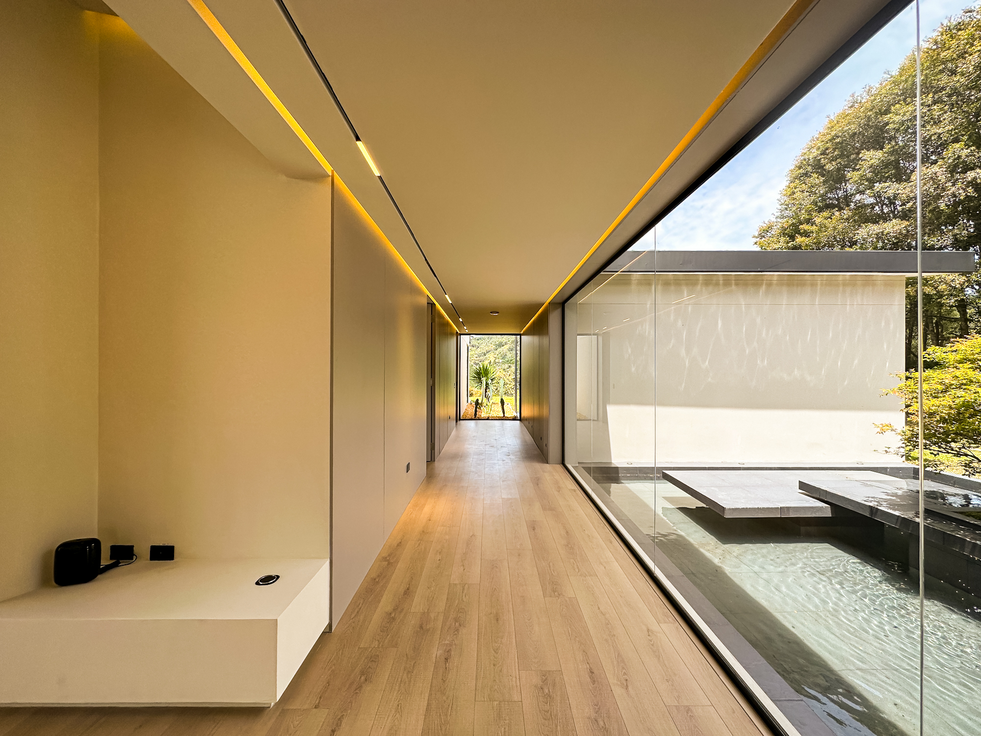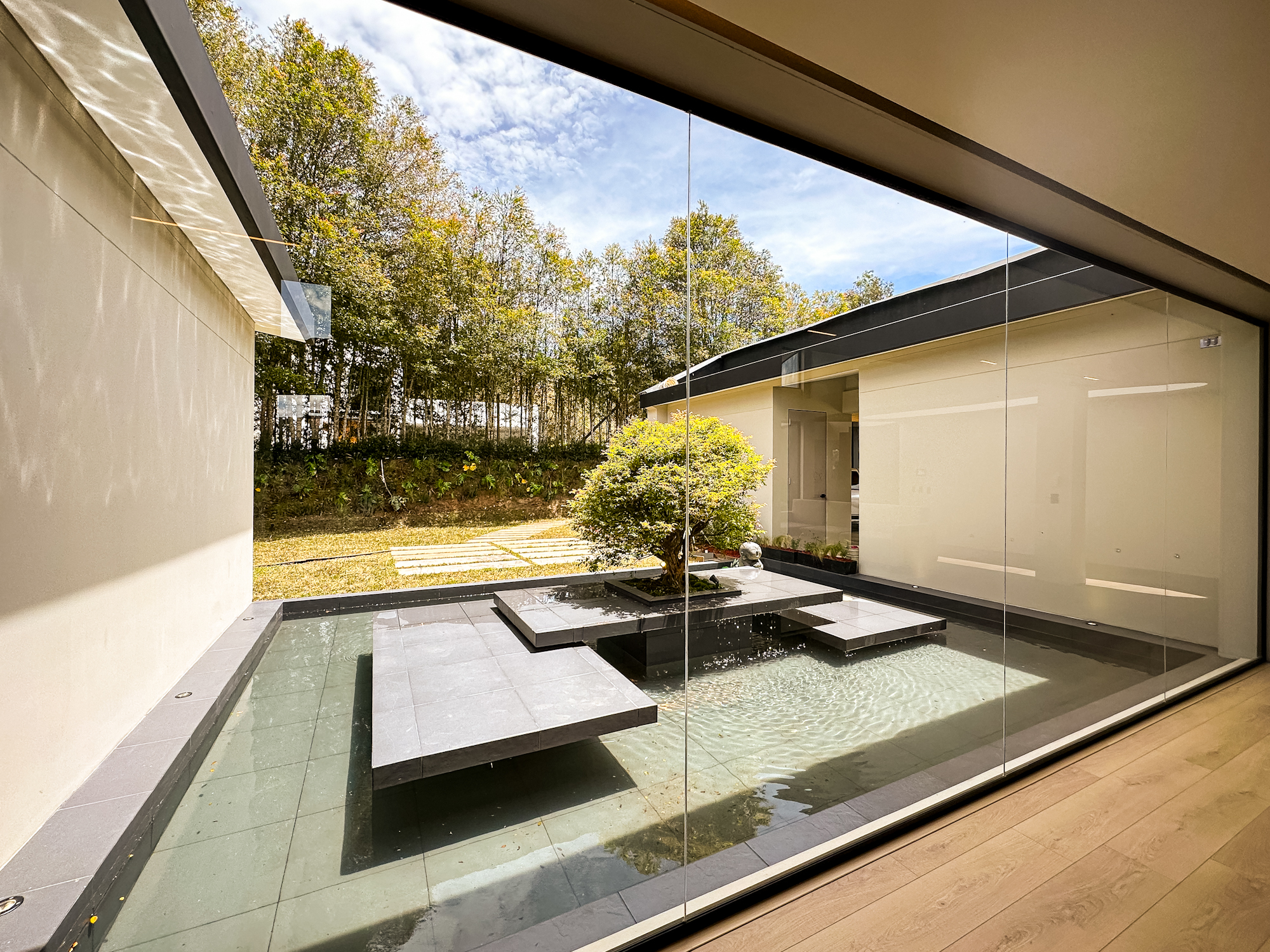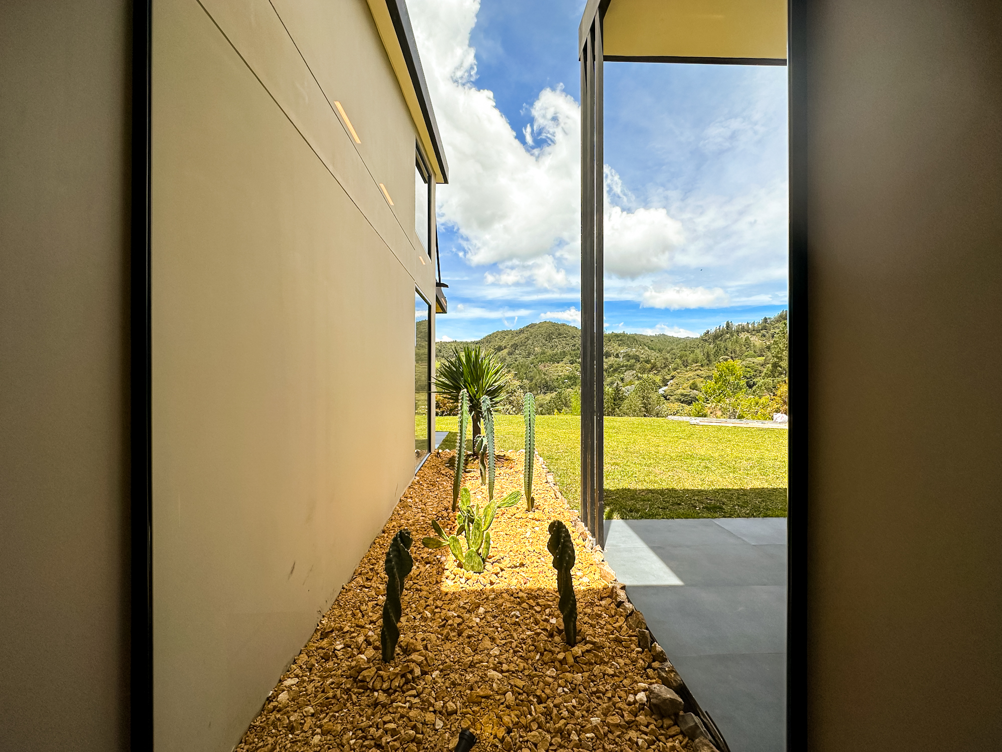 En medio de la majestuosidad de las montañas se encuentra esta exclusiva residencia, donde la arquitectura y la naturaleza se fusionan en perfecta armonía. Al ingreso, un imponente bonsái de 70 años y un espejo de agua con fuente reciben a los visitantes, marcando el inicio de una experiencia única.